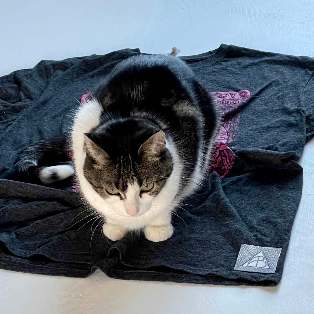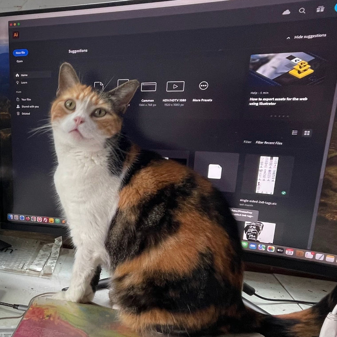 Feisty lives up to her name with her spirited personality. Despite her fierceness, she's the best purrer in the house, bringing warmth and comfort to our creative space.
